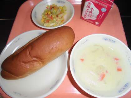 今日の給食では,鶏肉・玉ねぎ・にんじんを炒めて,じゃがいもを加えて煮,バター・小麦粉を炒めて「豆乳」を加えて作ったルーを加えて煮込んで仕上げました。豆乳のまろやかな甘さを味わって食べました。
