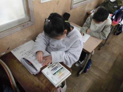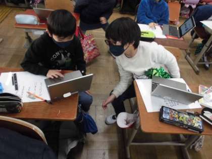 国語では,自分で考えた詩を画用紙に清書しました。ネームペンでなぞると,読みやすくなりました。文の長さを考えながら順番に書いたり文字を集めてデザインを作ったりしていろんな工夫が見られました。できた詩にふさわしい挿絵を調べながら書き加えることで完成です。最後まで丁寧に描いていました。