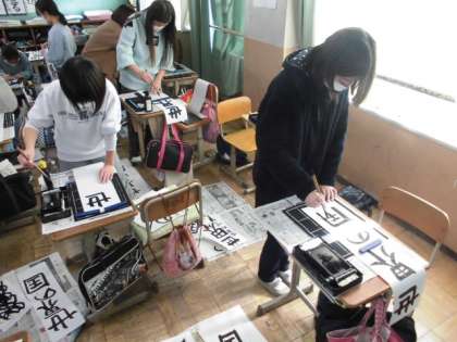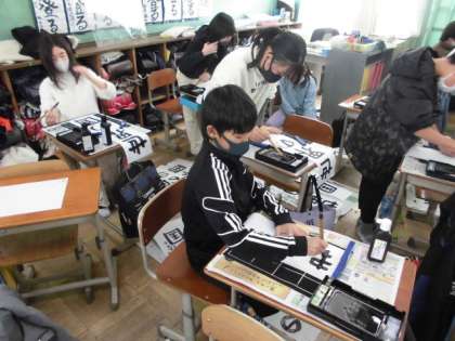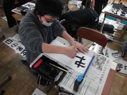 今日は1組が書き初めをしました。画仙紙といういつもの半紙とはちがう長い紙に書くので,全体のバランスが気になります。1文字ずつ集中して書いているので,ひと文字でもかすれてしまった時,とても悔しそうな表情を浮かべていました。それでも最後まで集中を切らさず,納得のいく字が書けるようにがんばっていました。