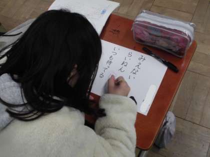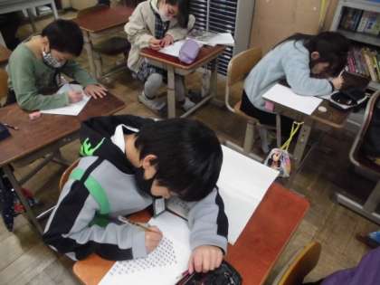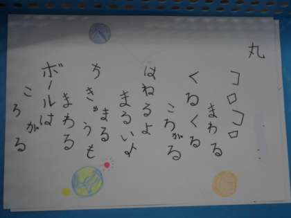 国語の時間には,ノートに下書きした詩を画用紙に清書しました。線も引いていない大きな紙なので,文字のバランスを考えながら書きました。字の書き方や配置など,いろんな工夫が見られました。空いているところには,挿絵も描いて完成させていました。