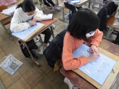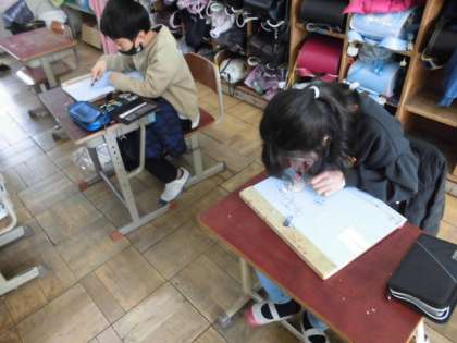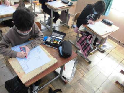 作品展に向けて木版画に取り組んでいます。下絵を板に写していたので,いよいよ彫刻刀で彫り進めていきます。彫り方や向きによって,版画にした時に印象が変わってきます。どこを彫るのか,どういう向きで彫るのか,よく考えて彫っていました。