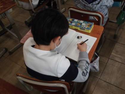 リンゴがきれいに並んでいます。たてに4個,横に12個ある時,全部でいくつになるか求めるための計算を考えました。かけ算を使って「4×12」と式は書けたのですが,さてここからどう計算すればいいのか考えました。4×9まではできるので,それと4×3をした答えを合わせるといった意見など工夫して求めていました。