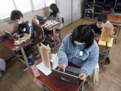 「くぎ打ちトントン」の学習では,いろんな形の木片をくぎで打ってオリジナルの顔を作ってきました。ようやく完成したので,友達の作品を見て「いいなぁ」「工夫しているなぁ」と思ったところを見つけた作品の写真を撮り,見つけたよさや感想をロイロノートに書いて提出しました。タブレットの扱いにも慣れてきました。