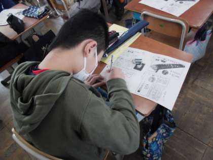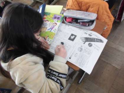 今日の音楽では,「春の海」という曲の鑑賞をしました。日本独特の楽器である「琴」や「尺八」を使って演奏されるので,楽器のひびきや旋律の美しさを味わいました。曲を聴きながら海の様子を想像していました。