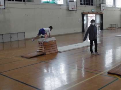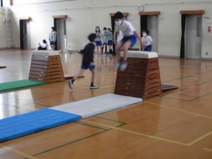 体育の時間には,とび箱運動に取り組んでいます。これまでに学習してきた経験を生かして自分にできる技で高さに挑戦しました。踏切や着地に気を付けながら,とび箱にしっかり手をつくようにしていました。