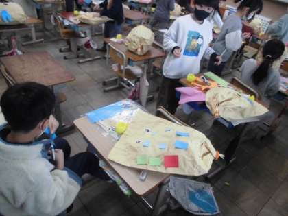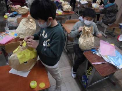 図工では,「くしゃくしゃぎゅっ」という学習をしています。大きなクラフト紙を使って自分の作りたい生き物を作っています。全体の形を整えられたら顔の部分に大きな目のシールを貼ります。場所や向きを工夫していたり飾りをつけたりしていました。