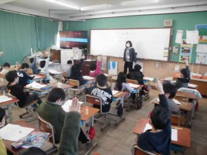 算数の時間には,数の直線を使って数の大きさを学習しました。「6500」は数の直線上ではどの位置なのか矢印で示しました。理由を聞くと「6000から5目盛り右に進んだところだからです」と答えていました。同じように3700や9900についてもできた人が前で発表していました。