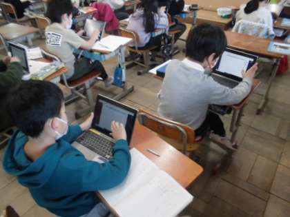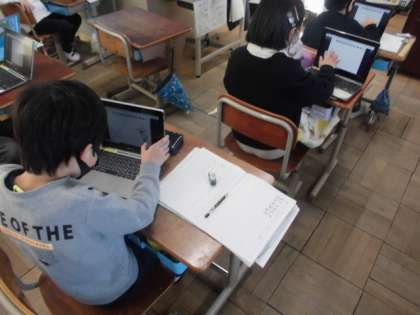 今日の国語では,反対の意味を持つ言葉を探しました。例えば,「このケーキは大きい」という文を反対の意味にすると「このケーキは小さい」となります。ほかにも「着る⇔脱ぐ」「立つ⇔すわる」のように反対の意味をもつ言葉がたくさんありました。その後,自分で考えたとっておきの問題をロイロノートで提出していました。