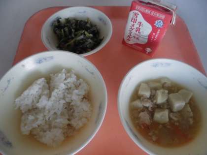 今日の給食では,鶏ひき肉・しょうが・にんじん・玉ねぎを炒めて,けずりぶしでとっただし汁・さとう・みりん・しょうゆで調味して煮,別の釜でけずりぶしでとっただし汁・さとう・しょうゆの煮汁で煮た高野どうふを加えて,水溶き片栗粉を加えて仕上げました。とろみのあるあんと食材を一緒に食べて味わいました。