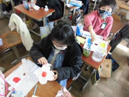 紙粘土に絵の具を混ぜて作ったカラフル粘土をカップなどの容器の周りに飾りつけていきます。自分のイメージ通りに作れるように色を調節していました。粘土をのばし過ぎるとすき間があいてしまうので,気を付けながら作っていました。