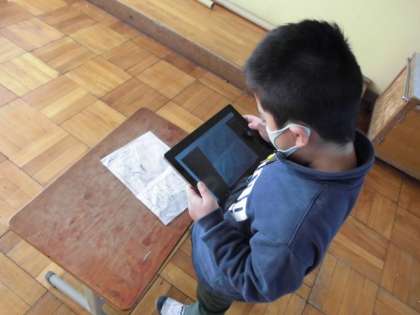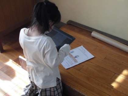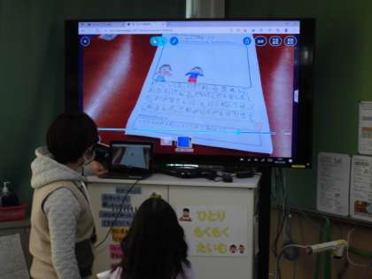 生活科の時間には,たくさんのニコニコを見つけてきました。おうちの人にもニコニコしてもらおうと自分が考えた作戦をやりました。やってみてどうだったのかカードに書いた後,タブレットを使って読みながら動画を撮影しました。自分の声がうまく入っていると喜んでいました。
