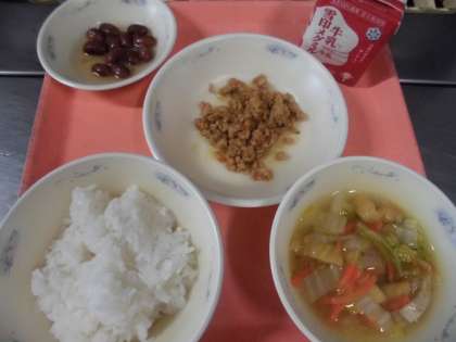 子供たちから,「『とりそぼろ丼(具)』は,ごはんによく合いとってもおいしかったです。『金時豆の甘煮』は,ふっくらした金時豆と甘い汁がとってもおいしかったです。」と,感想をくれました。