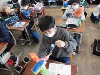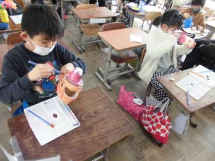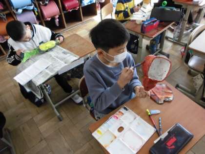 図工の時間には,いろんな材料を使って作ってきた小物入れが完成しました。今日は,仕上げとしてニスを塗りました。塗残しがないように細かいところまで丁寧に塗るようにしていました。少し時間をおいて乾かすと,ツヤツヤしてきたので喜んでいました。