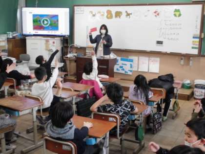 今日の外国語では,生き物や色を英語でどういうのか学習しました。赤い紙を見て「レッド!」と自信をもって答えていました。