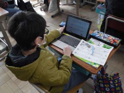 音楽の時間には,「ラ・ド・レ」の3つの音を使って,おはやしのせんりつを作ることに挑戦しました。拍の流れに合うようにタブレットに入力しながらプログラミングしていきました。できたせんりつを聞き直しながらあれこれ試していました。