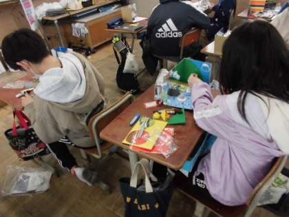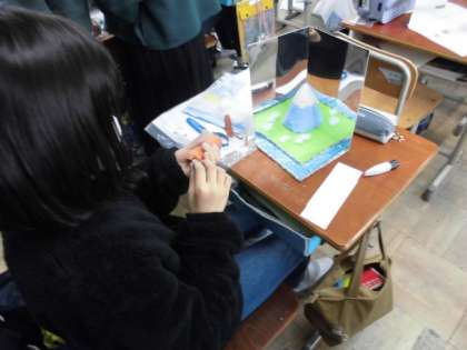 図工では,鏡を利用して奥行きのある作品を作っています。紙粘土に絵の具を混ぜて必要なパーツを作っていきました。細かい作業もとても丁寧にしているので,どの作品も出来栄えがきれいでした。