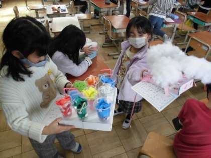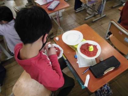 タピオカやわたがし,たこやきなど自分の好きなものを1つ選んで,ごちそうを作ってきました。今日は,できた作品について紹介カードを作りました。がんばったところや上手くできたところなどカードに書いていました。どの作品もとても美味しそうにできていました。