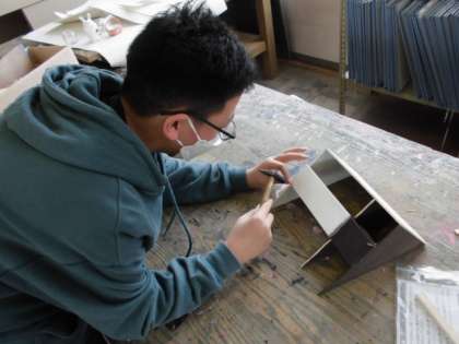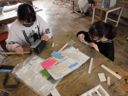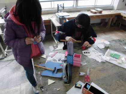 図工の時間には,一枚の板から切り取ったパーツに色を塗って組み立てていきました。ボンドでつけてから釘を打って,より丈夫にしていました。小さなパーツには小さな釘を打つので丁寧にかなづちを扱うようにしていました。