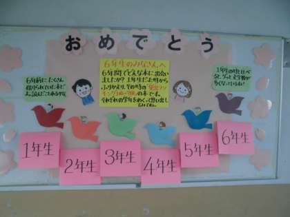 図書館の近くの掲示板には,6年生の卒業をお祝いする掲示があります。これまでどんな本をよく読んだのか,貸出状況からランキングを作ってくれました。それぞれの学年の時,どんな本を読んでいたのか,めくってみるのが楽しみです。