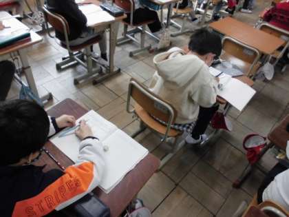 算数の時間には,紙テープを使って半分の長さがどれくらいか確かめました。さらにもう半分折るとどれくらいの大きさになるのか,実際に折ってみました。半分は1/2なので,その半分となると…。いくつに分けられているのか紙テープを広げて確かめました。