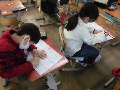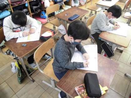 2年生の学習もほとんど終わり,今日の算数では,「はこづくり」の練習問題に取り組みました。学習したことを思い出して,辺やちょう点の数を答えていました。