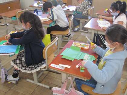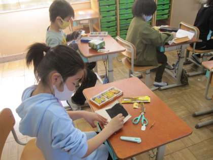 身近にある空き箱を開いて,その形から思い付いたものを,クレパスを使って表しました。動物に見えたり,人に見えたり,乗り物に見えたり・・・。みんな想像力豊かに楽しく表現していました。