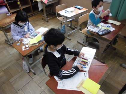 生活科の時間には,「ありがとうカード」を作りました。この1年間でお世話になった人へ感謝の気持ちを書いたものをメッセージカードにしました。イラストにはきれいに色を塗りました。どんなことでお世話になったのか思い出しながら一生懸命作っていました。