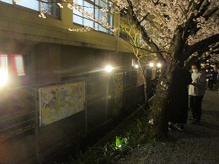 学校の北側,有栖川沿いの「ありすの小径」の桜はきれいに咲き誇っています。4月2・3日に地域の方々による「ありすの小径 花灯路」が行われています。多くの方が満開の桜を愉しみに来ておられ,昨年度に子どもたちが作成した自治会40周年をお祝いする絵も見ていただけました。