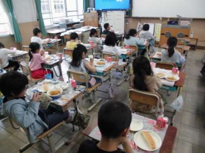 今日から給食が始まりました。今日のメニューはミートソーススパゲティです。りんごゼリーもついているので,子ども達はとても楽しみにしていました。給食当番のやり方も確認してから準備を始めました。「おかわりしたい人?」と聞くと,とてもたくさんの子が手を挙げていました。今は黙食なので,自分の席で静かに食べていました。