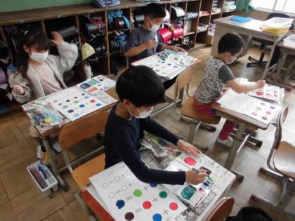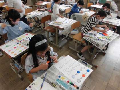 今日の図工では,絵の具を使っていろんな色を作りました。「赤+黄=オレンジ」「赤+白=ピンク」というふうに,混ぜる2色によっていろんな色が作れます。どんな色ができるのか予想もできない組み合わせで色を作っていました。