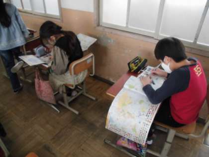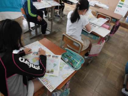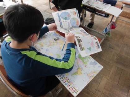 社会の時間には,世界地図を広げてどんな大陸や海洋があるか学習しています。日本は,ユーラシア大陸の西にあることやアメリカとの間には太平洋という海が広がっていることなど知りました。今日は,世界の国々がどこにあるのか,地図帳で調べました。世界が広すぎてなかなか見つかりませんでしたが,1つ見つけるとコツが分かったのか,どんどん見つけることができました。