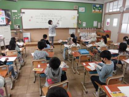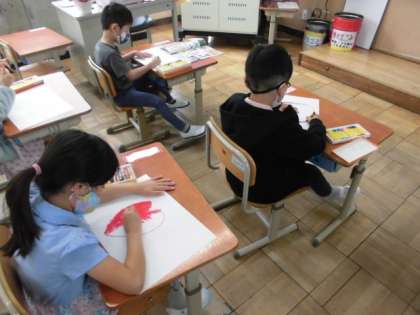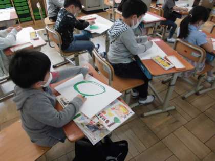 天気がいい日は,空からみんなのことを照らしてくれるお日さま。みんなが元気に過ごしてくれるとニコニコしているようです。今日の図工では,画用紙にクレパスでおひさまを描きました。好きな色や好きな形を選んで元気いっぱい描いていました。どのお日さまもニコニコ笑顔でした。