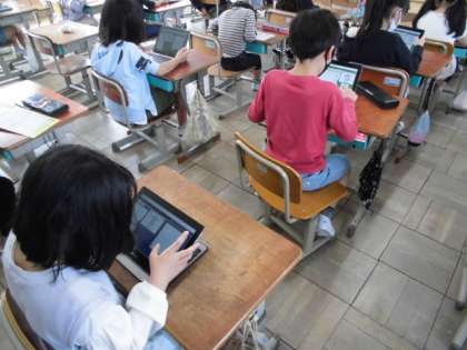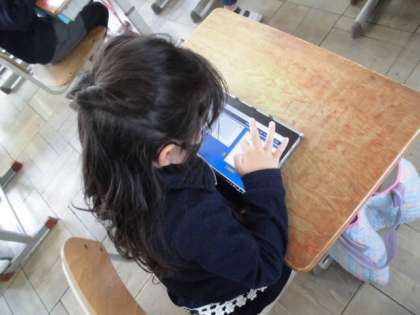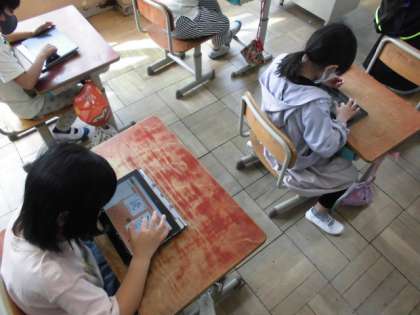 今日の国語では,タブレットを使って「ふきのとう」に出てくる新しい漢字の練習をしました。書き順通りに漢字の一部分の色が変化していくので,次にどこを書けばいいかよく分かります。タブレット上なので,指を使って大きな漢字をなぞって練習していました。