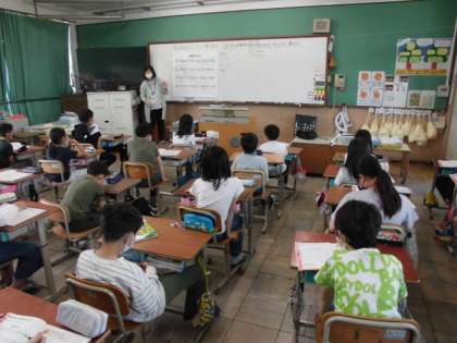 音楽の時間には,「花束をあなたに」という曲を学習しています。この曲には「♭」という記号が新しく出てきます。また,旋律が2つあり,音の重なりを意識した歌声になるようです。どんな風に歌えばいいか意見を出し合った後,お互いの声を意識しながら口ずさんでみました。