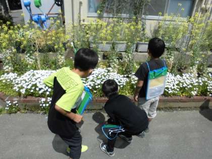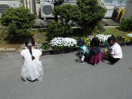 学校にもたくさんの花が咲いていたり生き物がいたりします。アゲハチョウが飛んでくることもしばしばあります。今日は,学校にある自然を観察しました。飛んでいるチョウは描くのが難しいので,花を選んでいる人がたくさんいました。「黄色い花の大きさは?」と聞くと「2cm。」と教えてくれる子もいました。