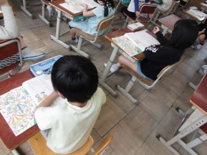 国語の時間には,教科書の挿絵の中から条件に合う人を探しました。まずは,白いぼうしをかぶっていて,青と白の服を着ていて,リュックサックを背負っている人を探しました。見つけるためには,大事なことを聞き逃さないようにすることやメモを取った方がいいと分かりました。