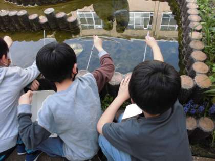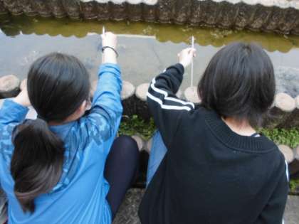 今日の理科では,実際に温度計を使って,空気や水の温度を計りました。ただ計ればいいのではなく,直射日光を当てないことや目線を垂直にすることなど,気を付けるポイントも知りました。学習したことを生かして中庭で気温や水温を計っていました。また,正確に気温を計るための場所として「百葉箱」が学校にもあることを知りました。
