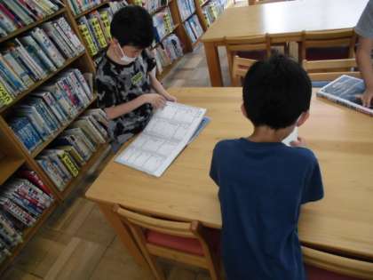 今日の午後から学校の図書館に行きました。自分好みの本を手に取り,気に入ったら貸出カウンターへ持って行って本を借ります。午後から少し暑くなりましたが,静かに本を読んでいました。