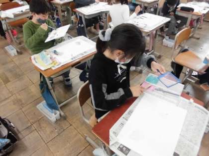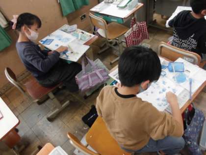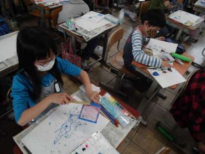 今日の図工では,絵の具を使っていろんな模様を作りました。ブラシや型紙,ビー玉などいろんなものを使うとどんな模様ができるのかいろいろ試してみました。色も工夫していたので,人それぞれでいろんな模様ができていました。