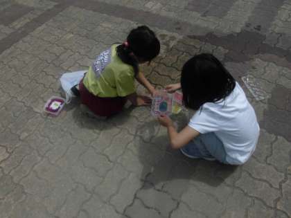 自分好みの色を塗り終わったので,出来上がったケースをもって中庭に行きました。少し曇っていたので,太陽が出てくるのを待っていました。雲の合間から光が差し込んでくると,ケースを通った光がいろんな色の光となって地面に映っていました。