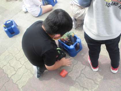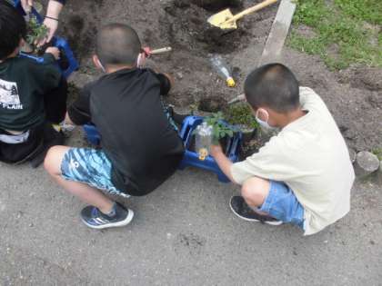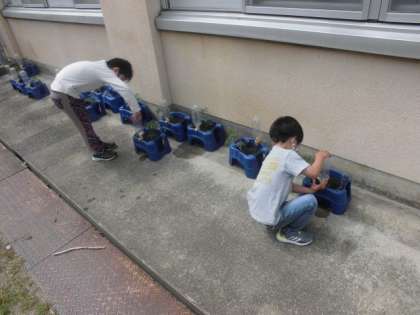 先日,植木鉢から雑草を抜いた土を使って新しい土づくりをしておきました。今日は,その土を使ってミニトマトの苗を植えました。自分の植木鉢にそっと苗を取り出して真ん中に置きます。その後,土を入れて中庭にもっていきました。最後に分量も気にしながら水をあげていました。
