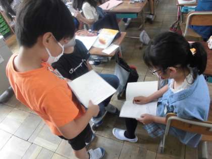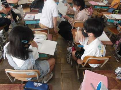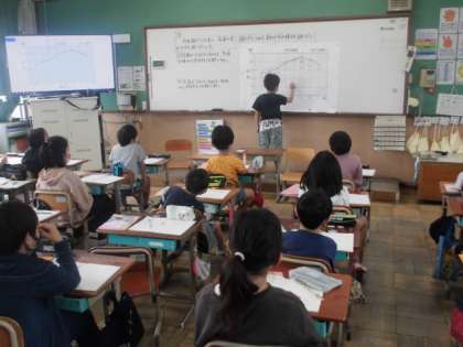 今日はグラフを見て変わり方の様子を学習しました。時刻と気温を結んだ点をつないでできた折れ線グラフを見て,気温が上がっているのか下がってるのか考えました。山なりの形からだんだん上がっている時間帯に気づいていました。その後,グラフから読み取ったことをどのように答えればいいか近くの人と交流しました。