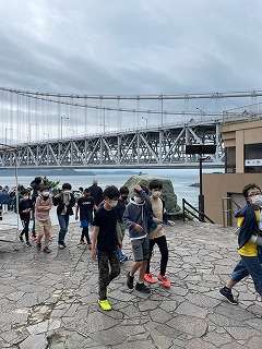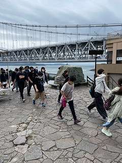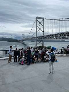 6年生は再び徳島の鳴門へ向かい,一つ目の目的地の鳴門大橋に到着しました。まずは鳴門海峡の景色を背景にクラス写真を撮りました。これから鳴門大橋の下側にある「渦の道」へ向かいます。