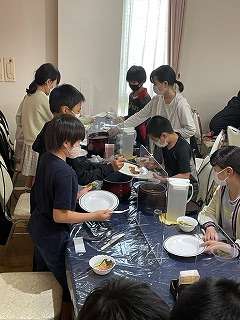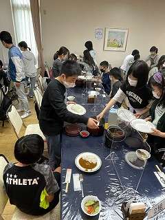 昼食はカレーライスです。自分の食べられる量を入れていきます。昨日のふり返りで話し合った目標どおり,班で協力しながら準備を進めています。