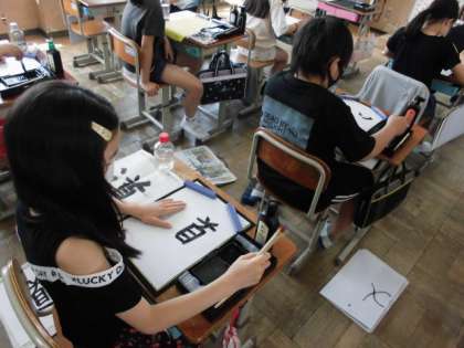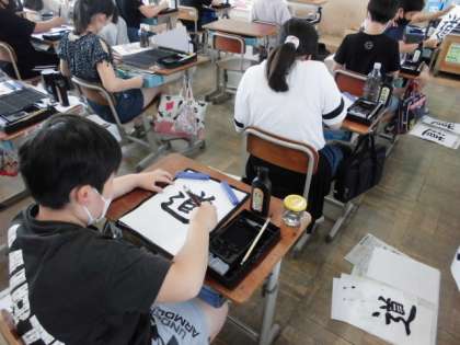 書写の時間には,「道」という字を書きました。首という漢字にしんにょうをつけるのですが,文字のバランスが難しそうでした。しんにょうは,筆の運び方によって細い部分と太い部分をつけながら書くようにしていました。