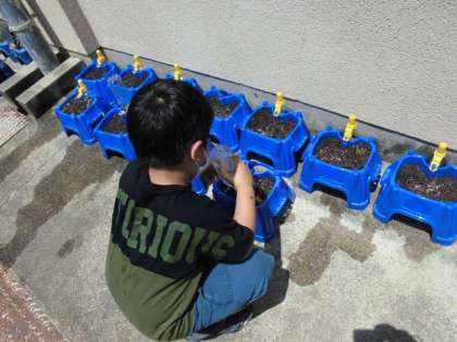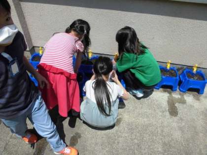 今日は2組がアサガオの種をまきました。植木鉢に土をたっぷり入れたら,指で開けた穴に1粒ずつ種を入れていきます。「芽が出てくれるかな」といいながら,水をあげていました。これから毎日お世話しながら観察していきます。
