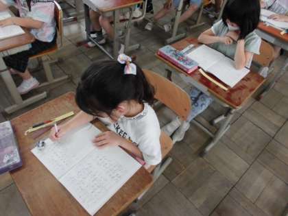 今日の算数では,1cmという長さを学習しました。教科書の挿絵を見て,9つ分といってた長さを「9cm」と表すことが分かりました。振り返りでは,もっといろんな単位を書いてみたいと発表していました。