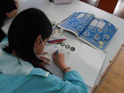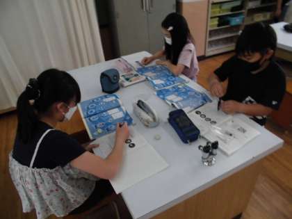 理科では,メダカのたんじょうについて学習しています。今日は,メダカの卵がどのように育っていくのか調べてプリントに整理しました。同じ卵でも時間が経つと,だんだん中が変化してメダカの形に近づいていくことが分かりました。その後,顕微鏡を使って卵を探していました。