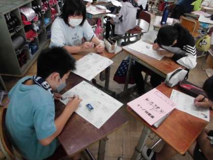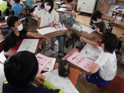 今日の家庭科では,調理実習の計画を立てました。グループごとに集まって,いろどり炒めとスクランブルエッグを作り方を確認した後,役割分担をしました。野菜を切る係や炒める係など自分にできそうな役割を相談して決めていました。