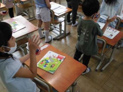 音楽の時間には,新しい曲に合わせてリズム打ちに挑戦しました。まずはみんな手拍子で練習した後,カスタネットでやってみました。「タン」の時はたたく,「ウン」の時は休むようにしていました。